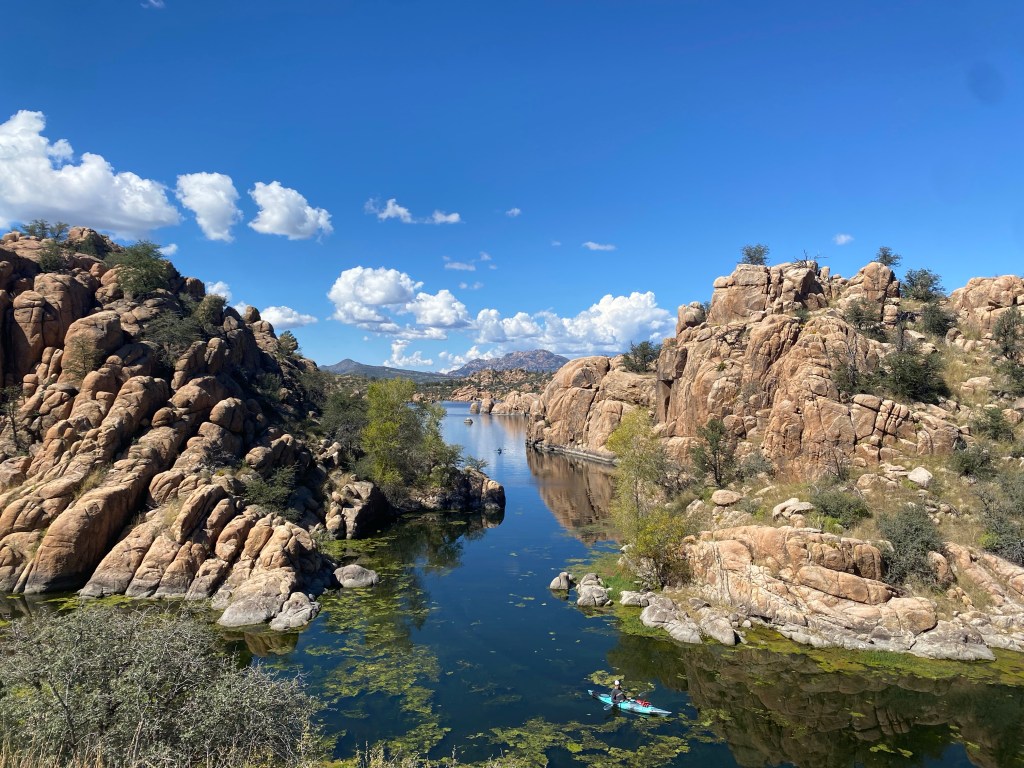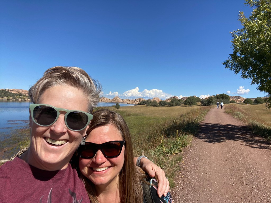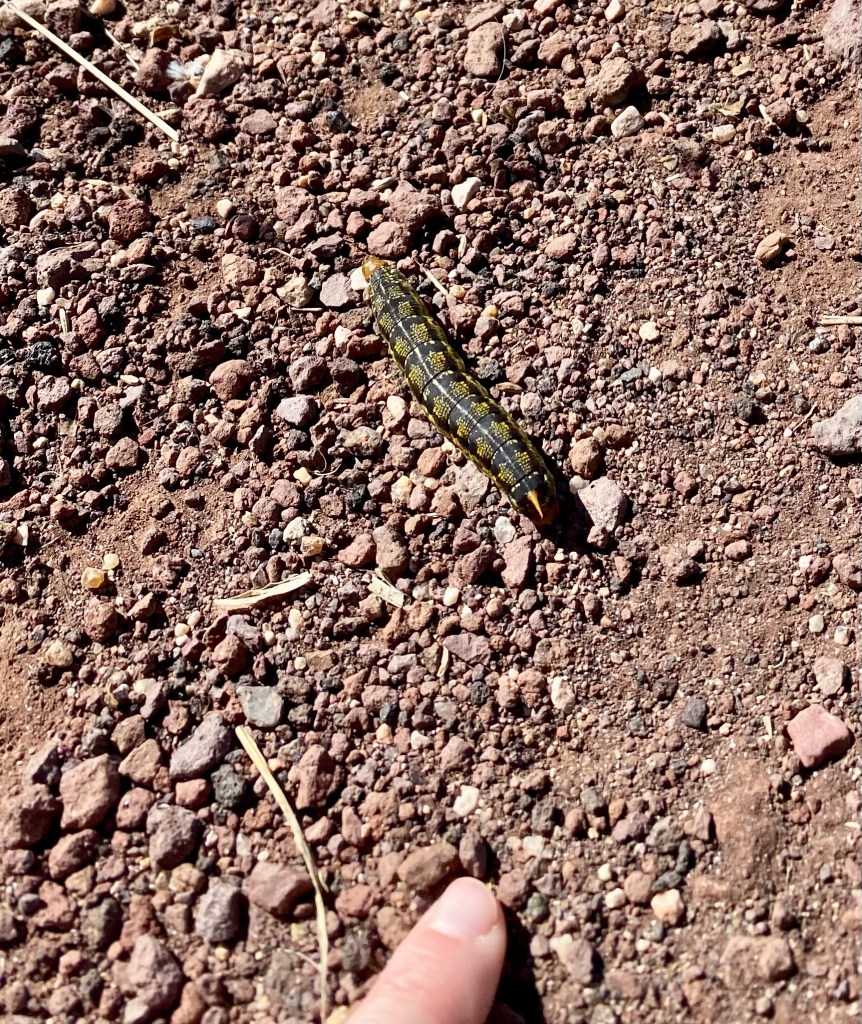 Mary Ann is another college friend. She drove up from Prescott to see us our second day. With the Pandemic, we haven’t seen each other in years. But that doesn’t matter. We “get” each other so well. Pueblo ruins showing the view from a cozy ancient home. they were in both sides of the canyon and able to collect water as it drained from the plateaus above. Who knew there were sizable lakes in Prescott? Here’s an egret. Mary Ann says Prescott is actually amazing for birding because the migrations stop over here. Nice place for a kayak. There are SUPs to rent but too expensive and getting cool enough out to not be worth it. There are also MTB trails, but they look pretty technical. We saw a “White-lined Sphinx” caterpillar. I must recommend the “Seek” App. It doesn’t get everything, but it’s cool to be able to look up what the moth looks like too. The caterpillar is cooler though. It’s iridescent and impressive in size. I almost stepped on it, I’m glad Mary Ann pointed it out. Prescott is prettier than I thought. Mary Ann is worth the drive, but the added benefit of pretty scenery is always welcome.