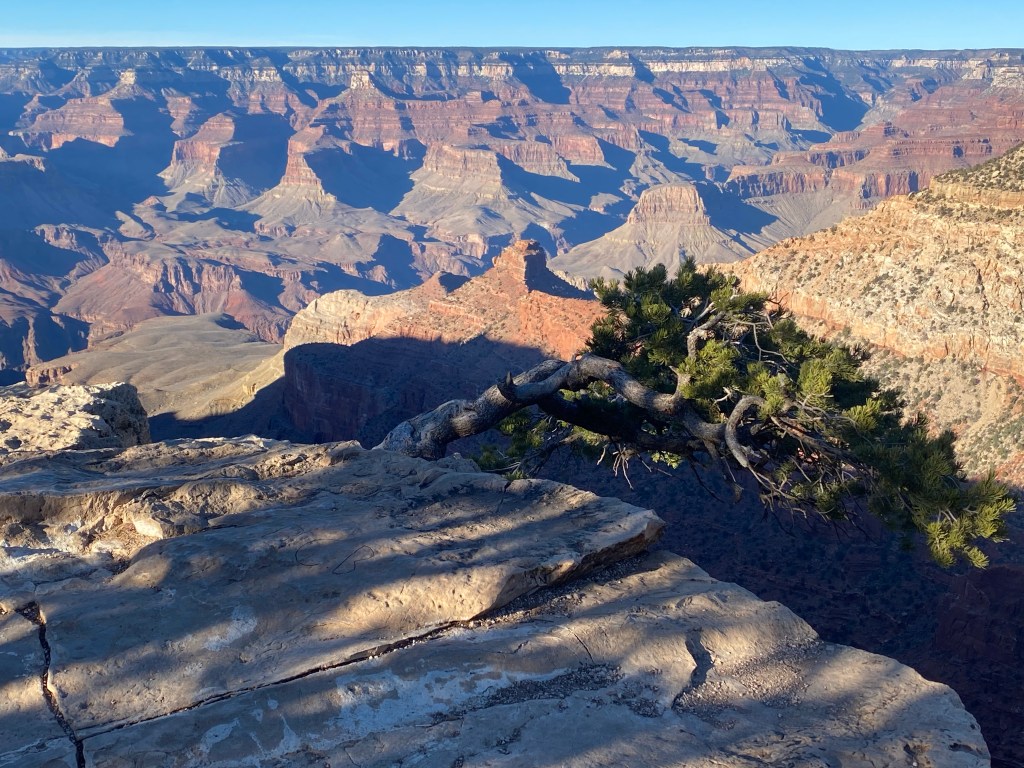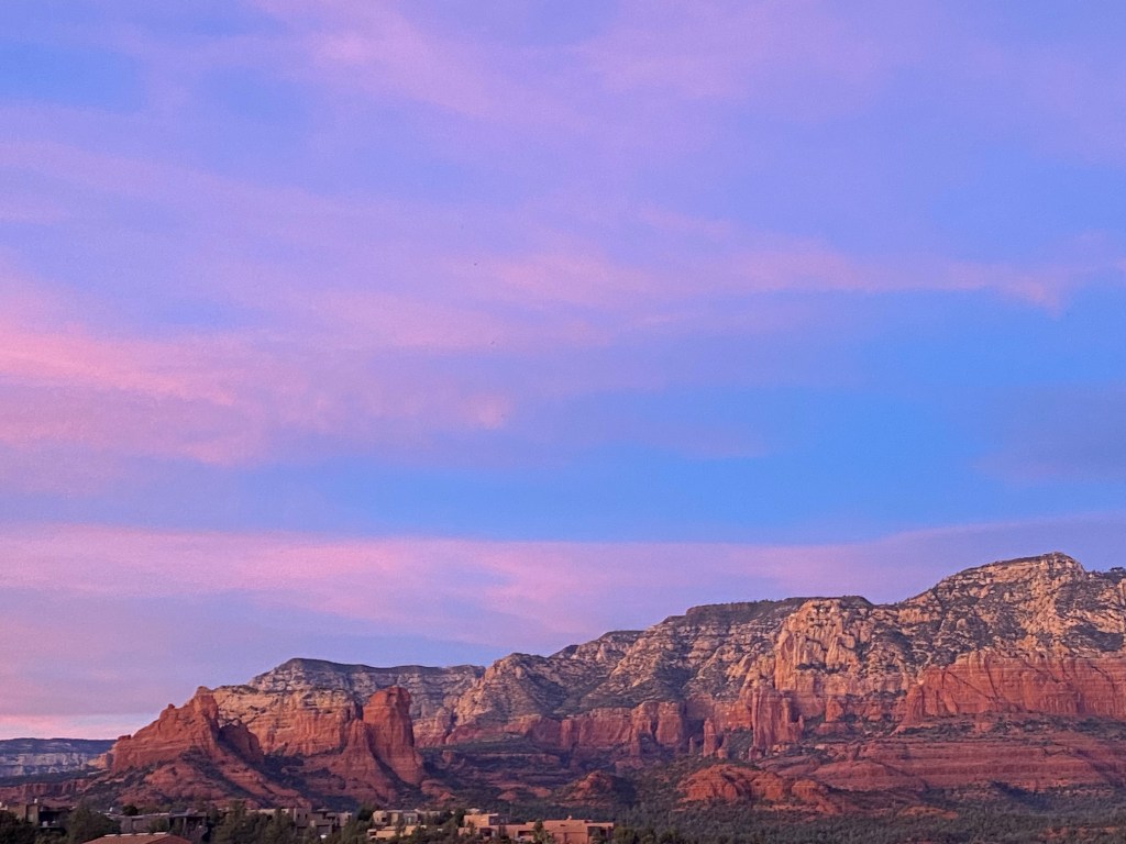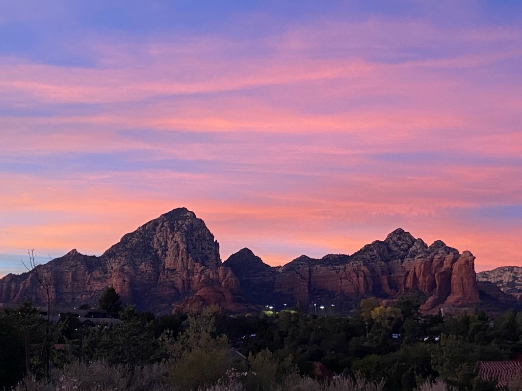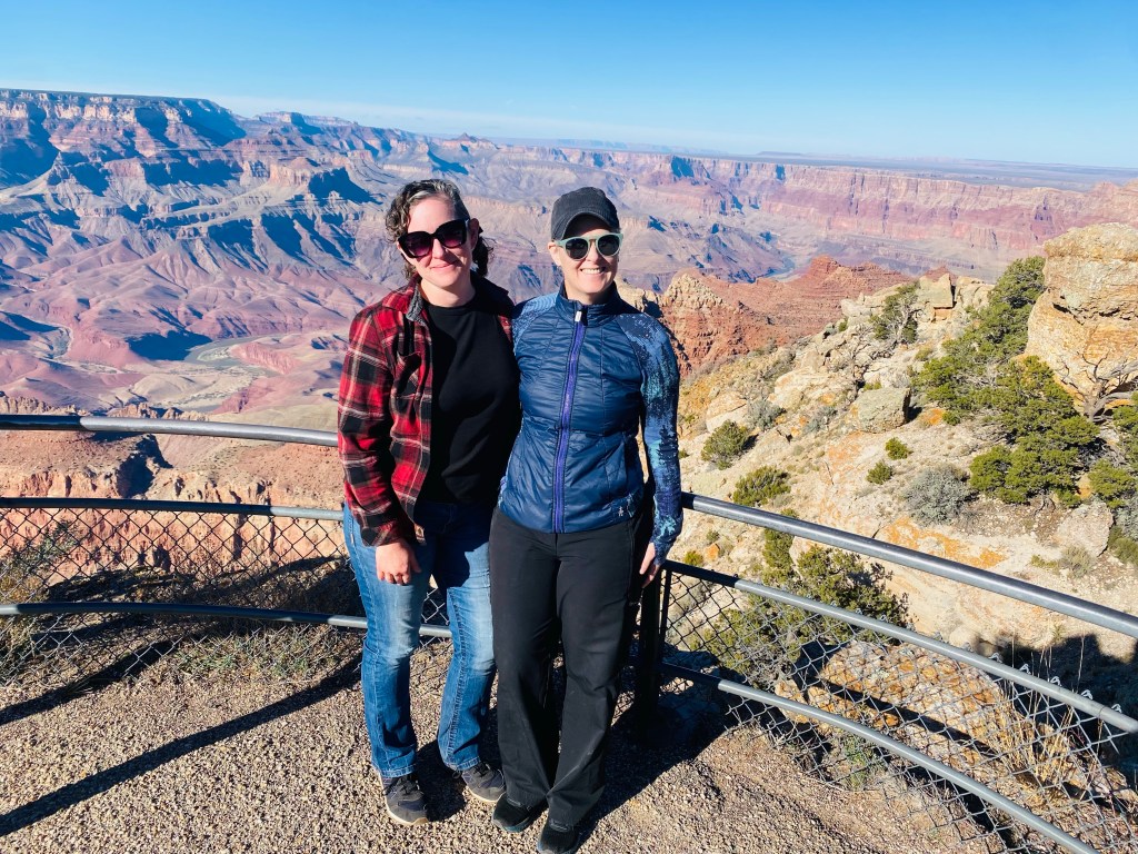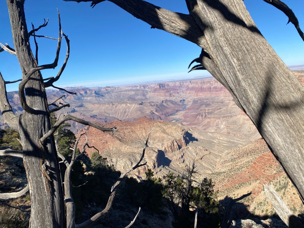 Snow from the library near one of the FIVE fireplaces.Riding in Prescott a last day. It was cold and we used our warm gloves which are not padded and bruised Zarah’s hand causing weird nerve cramps that have kept her off the bike a lot lately After the ride (so my hair is terrible) Last dinner with Mary Ann. There was this amazing band from Bisbee there too.Last visit to the Grand CanyonFinally made it to Desert View Watchtower, but it was closed to going up the tower 😦I also love the bleached wood with the view. The idea that a “Common Raven“ just lives here and can fly right off those cliffs and explore… The tenacity of life in the desert. Sideways out over the precipice, catching the sun and the rain and the wind. Winding it’s roots deep into the cracks to hold on. Last golden hour in SedonaWith sunsetSunset that makes you pull off the road to take pictures And more pictures The rocks with the sky is so amazing there. Last fancy coffee at Fire Creek – the Dark sky has a shaved pillow mint in it and the s’mores is served with the marshmallow on fire. Pretty fun. And a good way to fuel up for the drive to Albuquerque.