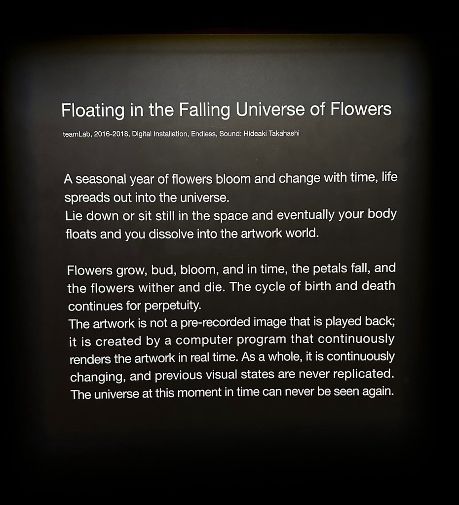We loved this art group and plan to go to their installations in any place we can. Osaka and Singapore are definitely getting a look. I love that they wanted to get you into your body and immersed with nature, but can use technology to do that. I didn’t expect it.