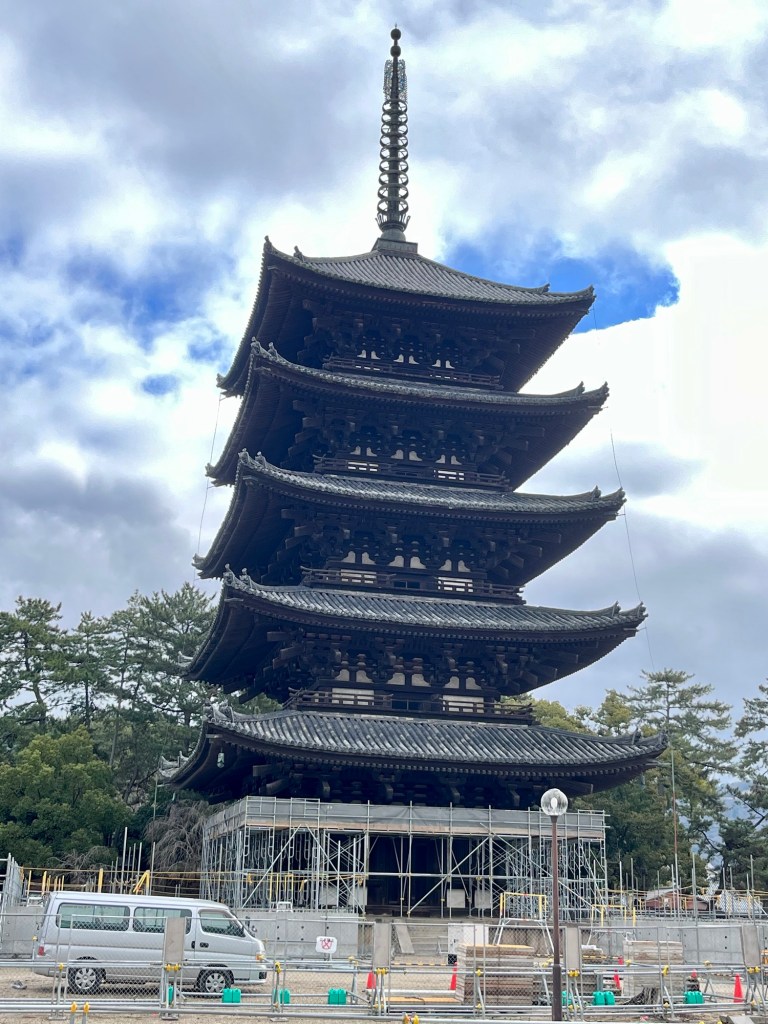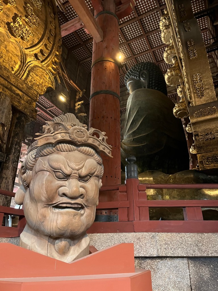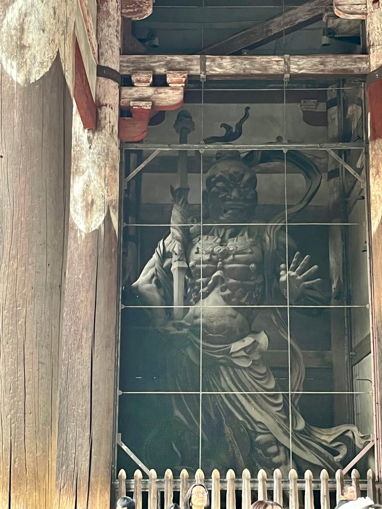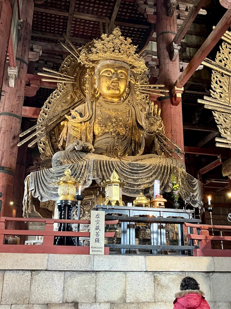 Our lodging is right near the Kamo river and there is a lovely recessed walking path all along. White-faced herons and also great egrets are quite the common site. And the herons especially do not seem to mind being pretty close to humans. I rarely get this close to the great blue herons at home and these keep letting me. The mountains from the bridge by our hotel the first afternoon. I love that layered effect with the clouds. This must be in Kyoto Goyen National Garden. The sun was lovely at the golden hour. We also found our first whiff of the wintersweet tree that has been starting to bloom in the week. It smells so good! The wintersweet is special because it comes first of all the fragrant flowers, in January to remind you spring is coming. And the we found this amazing place was about 1/2 a block from our hotel. So yummy fruit ice cream, and with crunchies in the middle and vanilla on top with toppings! We had one every evening, until it snowed Wednesday and Thursday and they didn’t seem to open. The next day this temizuya was particularly striking with its dragon. It is a purification ritual before going to the main hall of a shrine to pray. You use the ladle to rinse the left hand and then the right and then your mouth if you choose- I saw many folks not do or almost mime the mouth part. Kyoto is known for its many very ancient Buddhist temples (1600 of them!) and Shinto shrines (400). They are cool but the crowds have bothered me more here than Tokyo. To me a visit to a shrine is to feel awe at the number of years and number of people this place served for ritual and prayer. Having many people who clearly are there just to take a photo and seems sad for the few who are earnest in their prayers. Also, because I am ignorant of the differences between pure land Buddhism and other specific sects, I find the descriptions of the Buddhist temples mostly less interesting- year founded, who the person followed in faith. The Shinto often will explain this is the place to pray for good harvests or easy childbirth etc and these don’t give me enough anchor especially in the crowds. They are certainly still very impressive in construction, especially considering these are likely from the 1100’s. This is in Nara where the capital was in the 900’s. This one stood out though. This is Todai-Jo in Nara. It was built in the 700’s and was both a place for training monks and learning Buddhism it was also a place people prayed for the peace and happiness of all people. It has a MASSIVE Buddha statue. Notice the tiny buddhas in gold surrounding him. And two golden Buddhas on either side of the big bronze one. I looked deeply into the eyes of the one on the left for a long time and I felt a power coming up from the ground making my body tingle and feeling lifted up. Not literally, but energetically. I was grateful for that. And various protectors arrayed: at the gateBehind,And on the front corner. I paid the admission fee for this guy. It is a statue of Binzuru who was said to have mastery of the occult and psychic powers. It is said if you rub the part of him that corresponds to a pain or ailment you have it will be healed. And I have to say, my knee that has been bugging me for 3+ weeks suddenly was a whole lot better the next day. I’m not questioning how or why, I’ll just take it. We went to Heian Jinju a temple and a quite lovely Garden in Kyoto. This temple is also cool. But again very crowded so I felt less grounded or intrigued because I was busy dodging people and trying not to block peoples pictures. There was a cool bamboo grove there.We were happier on the walk up the path away from most of the people. And looking at the mountainAnd when we see the animals.