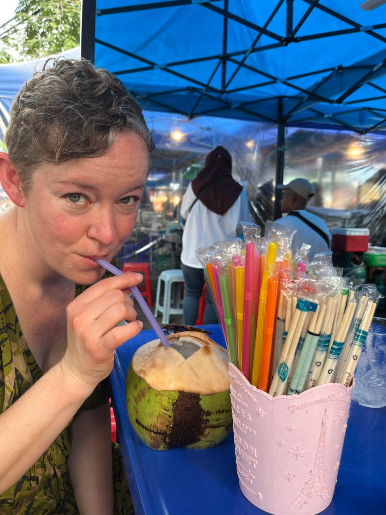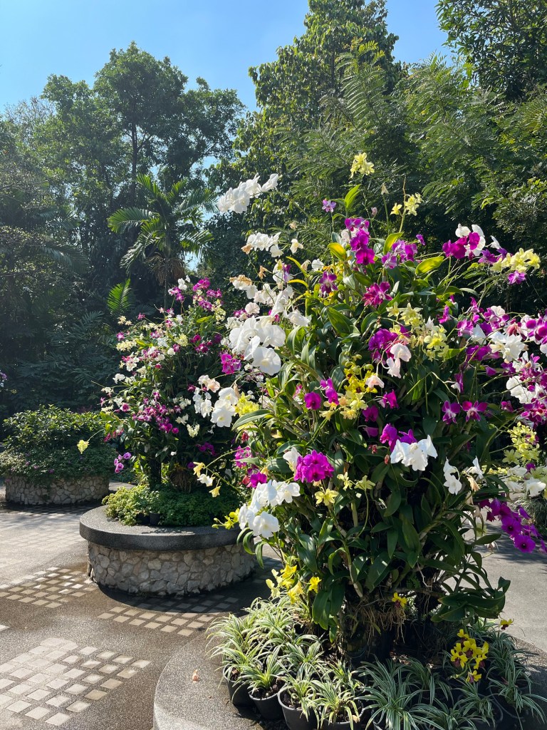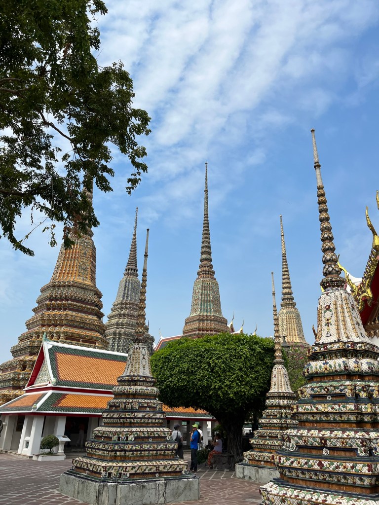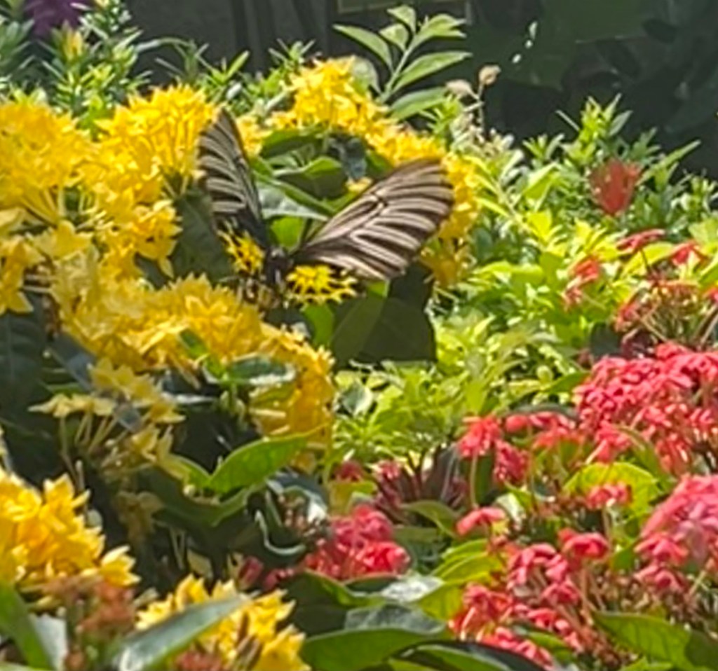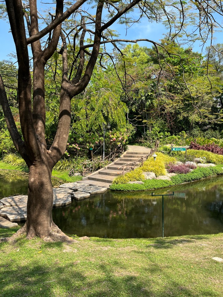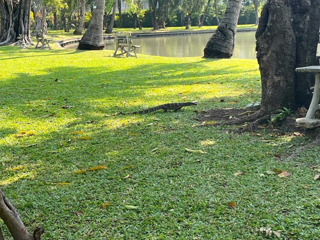 Realizing how important nature, walking and a sensory reset were, we looked for a park near where we stayed and took a walk the first day. It was so warm and more what our original vision of the trip would be. They had public exercise equipment- three different areas like this. Impressive orchids that don’t need a greenhouse for o stay alive since it’s 90F and humid pretty much all the time. I could definitely commit to getting rid of all the cold weather clothes! It is usually hard for me to get rid of useful items, but clearly the cost wasn’t going to be needed…at…all.And a free butterfly gardenThis was enclosed so they don’t fly away or get eaten by crows and mynah birds. This lady was very friendly and was wearing a truly perfect dress! Pretty magical. I hadn’t remembered this so Zarah was unprepared. Which was even better. Then we ran into this guy, at least twice the size of the first! The patterns on their backs are lovely. There were workers out leaf blowing and raking and there were lights and guards to make us feel safe walking home at night. Then we got to the Chatuchak weekend market. I have never seen anything like it. Stalls maybe 6×12 feet and packed together into 15-20 aisle of 60-80 stalls. Then a diagonal section adding another half. Trinkets, clothing, food, massage, art…in the evening there was a really good DJ we listen to for a while. We barely scratched the surface, but we were there at least 7 hours. Somehow the crowds don’t bother either of us nearly as much when they are people going about their varied activities. The tourists on a mission are what seem to be draining. We could watch people here all day, and we did. We didn’t take many pictures though. The energy but also the relaxation of moseying and shopping don’t really come out.