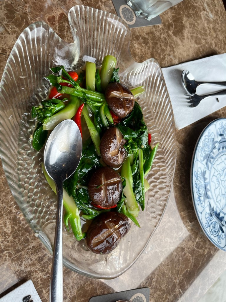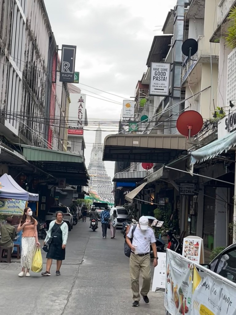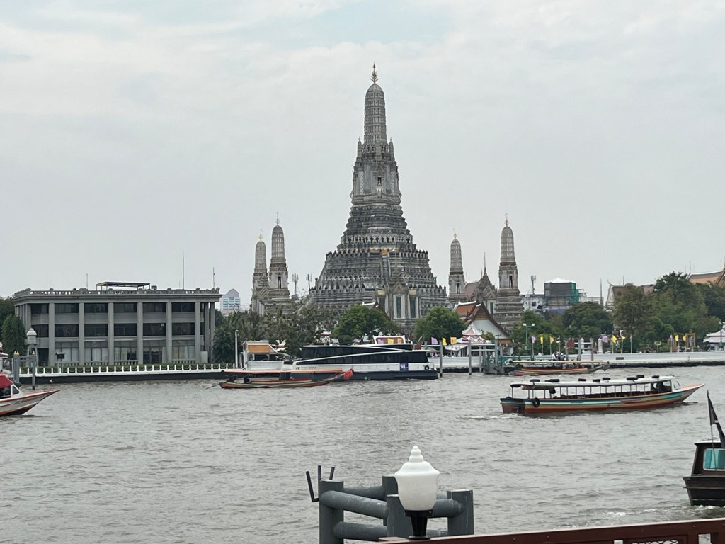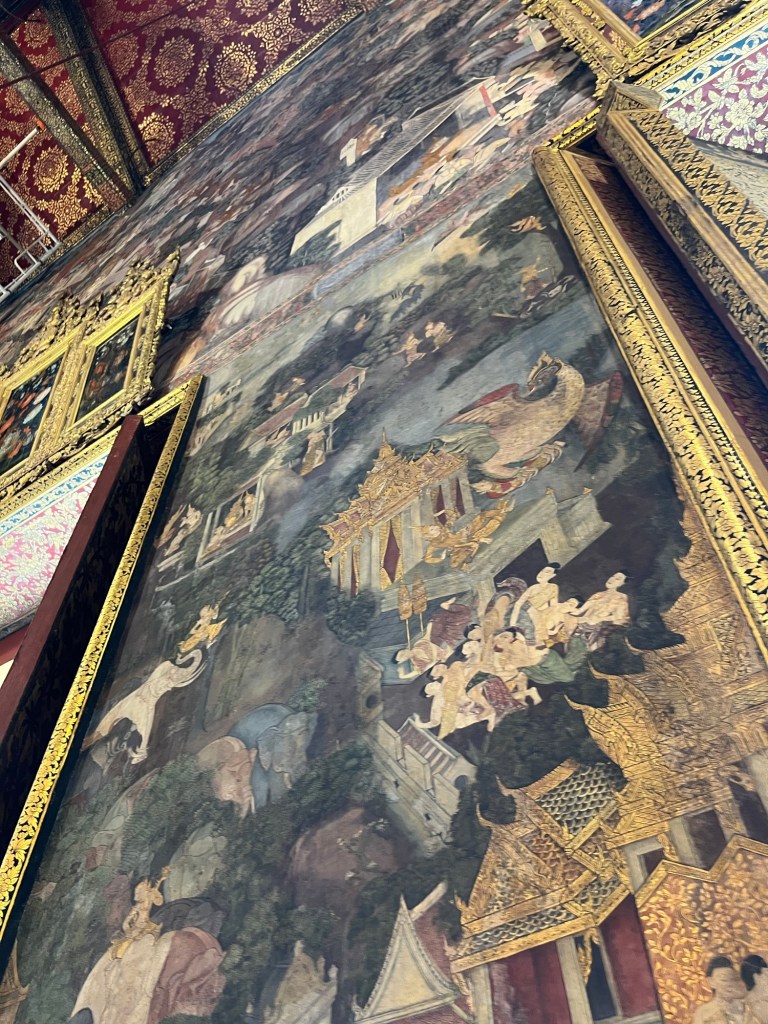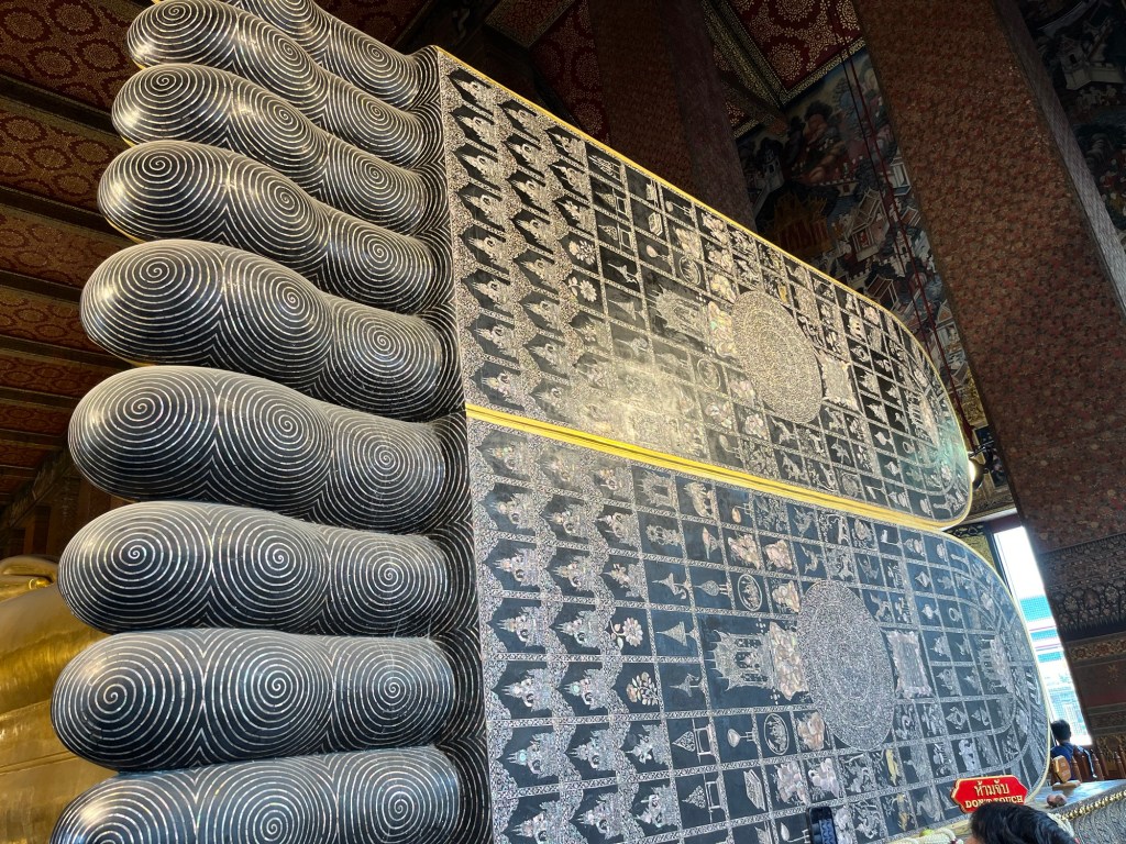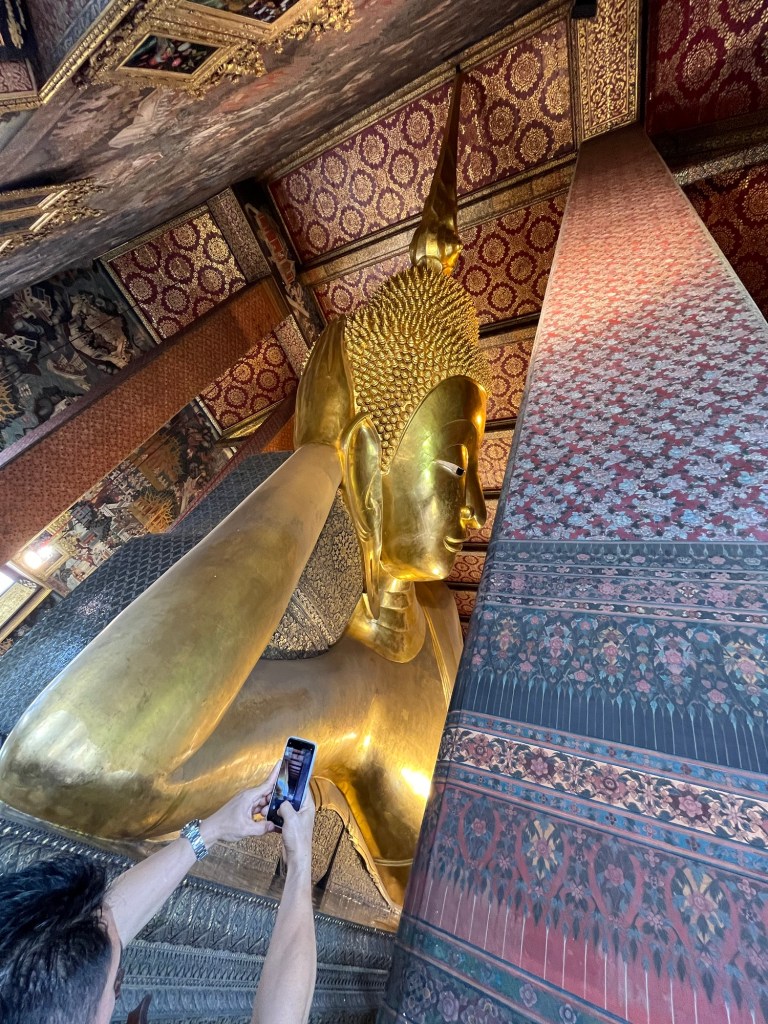 We didn’t find out until later this is the largest open air market in the world.Bad air quality makes for a beautiful moonrise. Day two was getting to the big temples and palace. I loved the many fountains with statues doing yoga. At one point there was some call and response chanting coming from one of the bigger buildings. This is Wat Phra Chetuphon.This is the reclining Buddha. He is 46 meters long… meters!The detail on the walls is almost as much a sight as the 46 meter long main attraction.The soles of the feet have “108 auspicious symbols by which the Buddha can be identified” inlaid in mother of pearl. This was so genuine and kind it made it more special. Pretty extreme heat for a second day when we have been in winter for several months was getting to us. So we found a nice little restaurant with a Michelin star. This water spinach side, Crab dip with veggies, and pad Thai with shrimp, and mineral water and virgin mojito all under $35. And did I mention the view out the window of Wat Arun? Even after eating in air conditioning we weren’t feeling great so we skipped the boat ride and the palace and the temple of the Emerald Buddha. I needed to refill some meds and had to get to a doctor’s appointment for that before we head to the small island of Koh Tao the next day. Next day had a pretty sunrise. And the 8:40 am flight took off at 8:25!