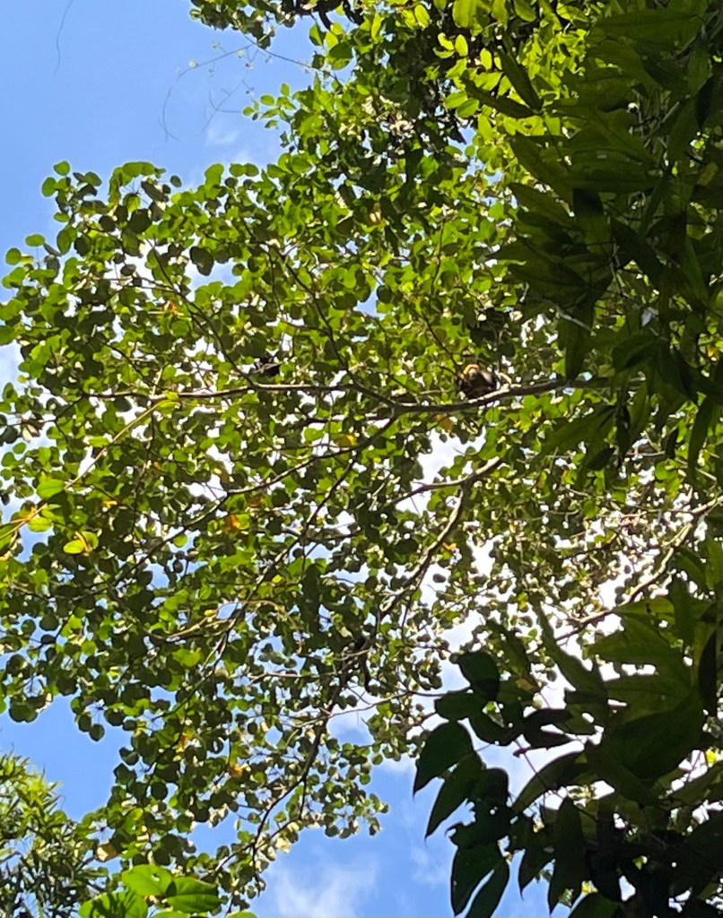 Lemurs up the trees, too far away to see well in pictures. But one had a reddish baby tagging along on her stomach.