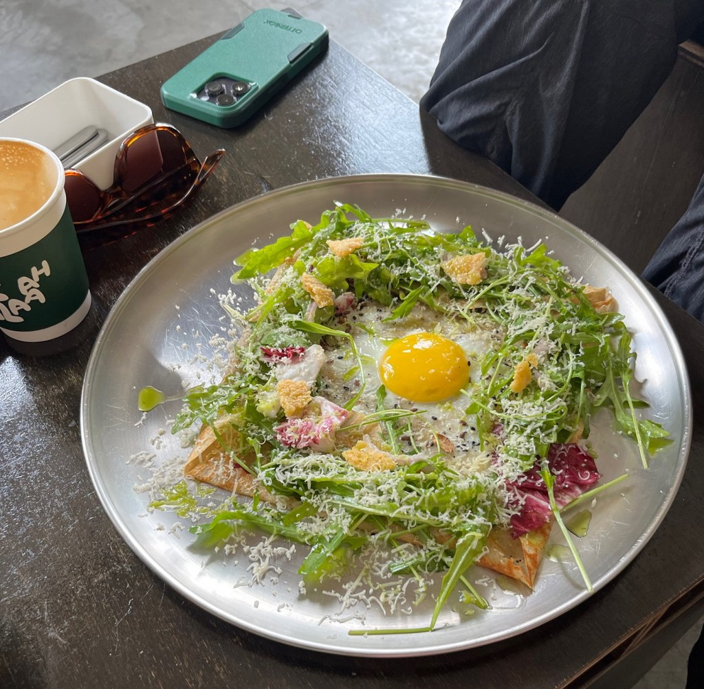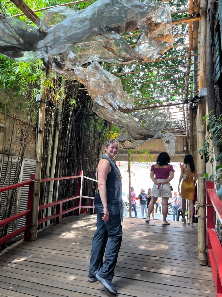 Very cool Chinese ancestral hall for the Chan/Tan/Chen/Chin etc clan. It is about 2 blocks from our place. Clans would help you get started working when you immigrated and the hall was an important place in the early 1900’s especially. The detail on all the figurines on the roof are just exquisite. Flaaah Bakery and cafe is about 2.5 blocks from our place. Left to right: Cinnamon latte, Spinach spinach spinach (think giant spanakopita), crookie (chocolate chip hazelnut cookie kept thick and wrapped in croissant dough), and rose latte.The rest of the case… this is an amazing place and the staff are really sweet. Buckwheat crepe (gluten free!) Magic little alleyway just off a side street with dumpsters on it.They are made to look like mahjong tiles. But they move and flutter over your head. The lattice work lets vines grow so it is shaded and cooler than the street. Wall art that incorporates actual objects into the pictureNote the jump rope actually exists, and the basket. We had no idea this was here. We just wandered in on our first morning walk. It really felt like magic!