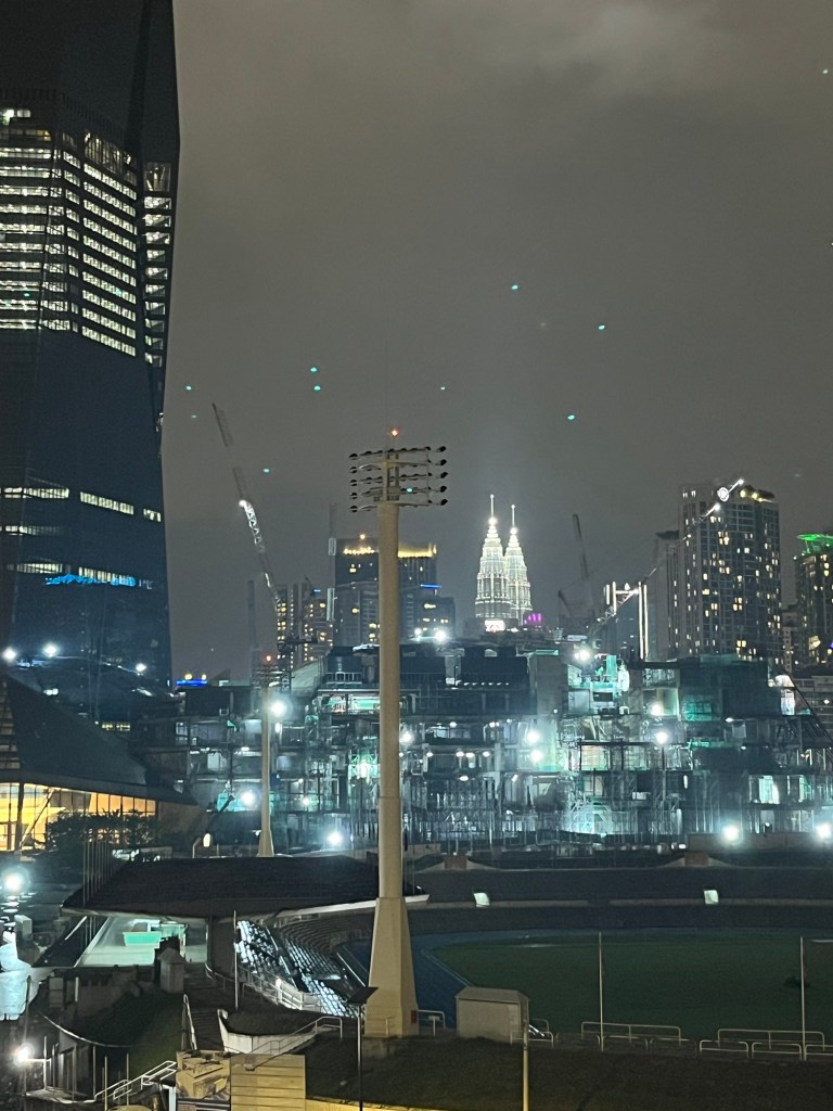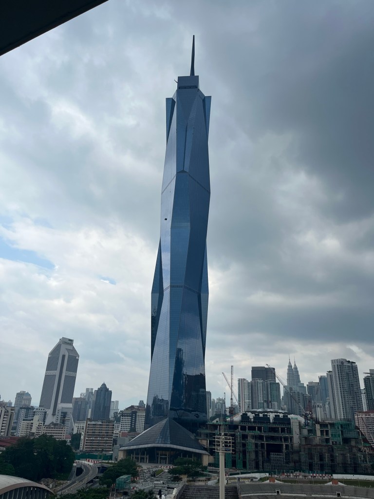 Night view from the infinity pool on the 8th floor of our building. It is so hard to believe this place is half the cost of a Budget Inn at home. Close up of the iconic Petronas Towers from our bedroom window. Actual size with the construction continuing on the big black building named Merdeka 118 and not open yet for a few more months. The stadium in the foreground is where independence from Britain was announced and celebrated in 1957. Merdeka means independence in Malay.Mosque built as part of the Merdeka complex. The image is iconic around here of the independence announcement. the building is meant to evoke the same image with the spire being the man’s arm. During the day. Overly repetitive, I know, but the building is becoming a friend we see many times per day. And most of the time wherever we are in town we can see where home is.Swing on the roof level of our building.