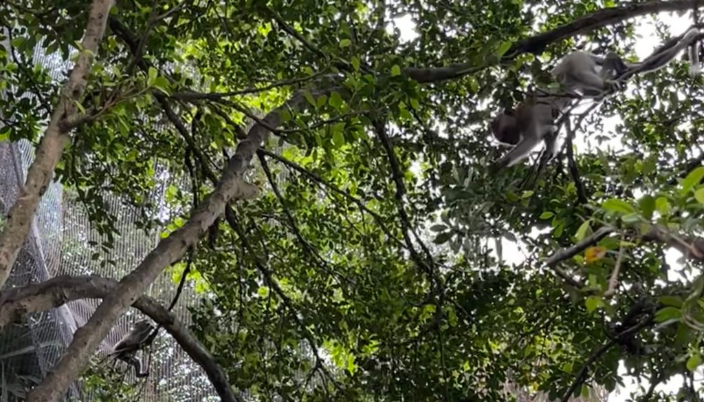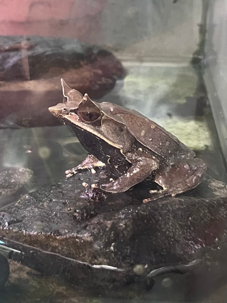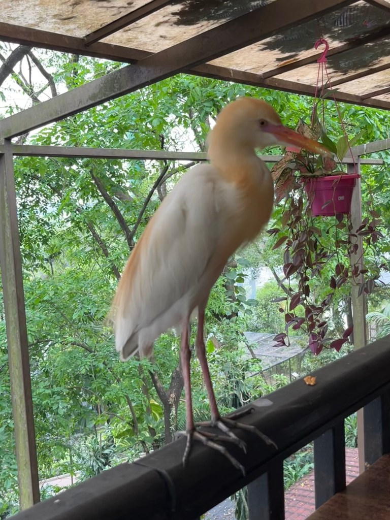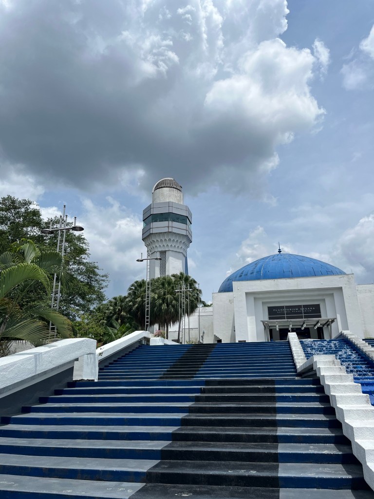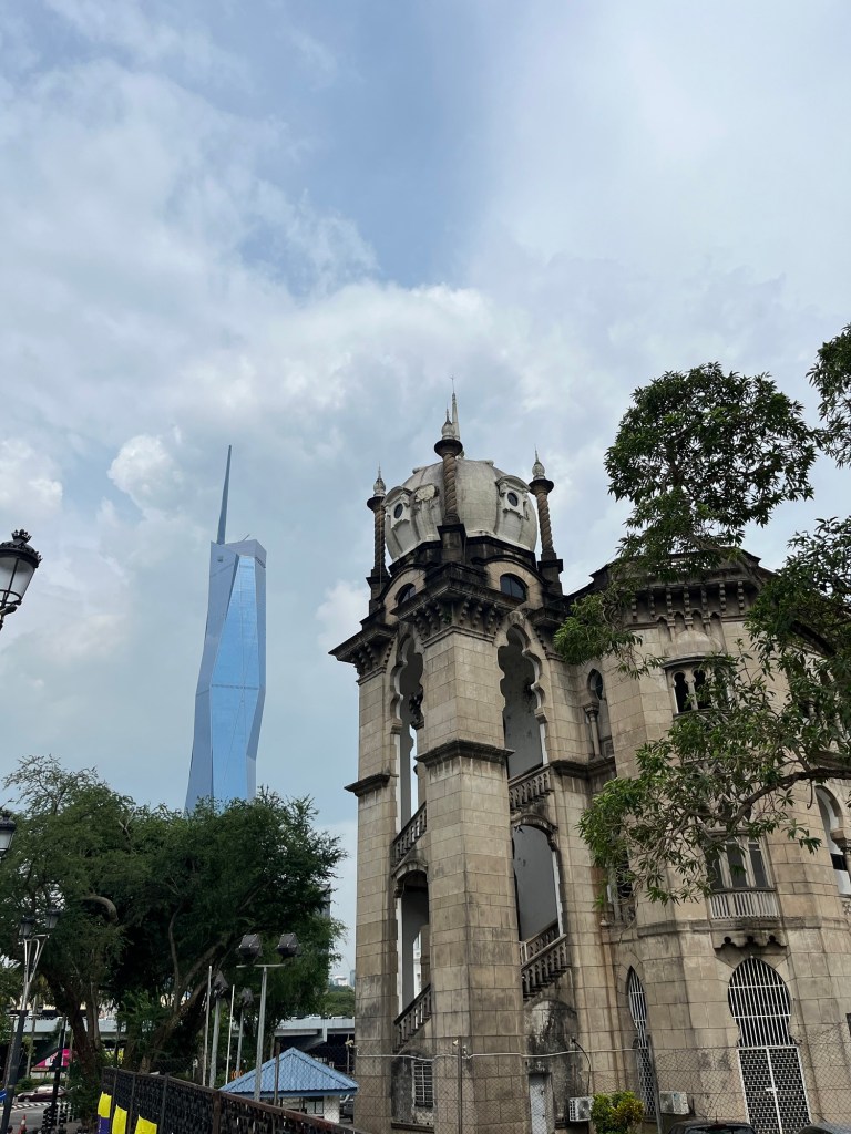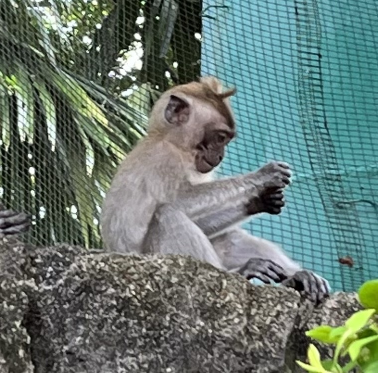 The Malaysian National butterfly: Raja Brooke’s Birdwing. They have a really cool underside as well. They had so many that were really big and spectacular Or just bright and beautiful Or again really hugeAnd familiar from Taman NegaraAnd sometimes they land in you to drink your sweat. It feels really weird for them to crawl around a little. They also had other bugs on display. I am quite sure I have never seen any insect this large. Close up of the face. 🙂And such a pretty turtle And such a cranky frog. We were hot and sweaty and knew we needed AC and went to the planetarium. But we were also more hungry than we planned, so didn’t stay very long. And found ourselves at the KL bird park restaurant and it was monkey o’clock.There were more youngsters and babies than we saw in the national park. Sadly, I think they are well fed by humans despite signs telling people not to. Lunch itself was also joined by this guy (cattle egret) and his friends who know where to get a meal. It is pretty neat to be in the bird enclosure for lunch and the visitors were respectful enough. On the walk home. The juxtaposition of old and new is always so surprising to us Americans.