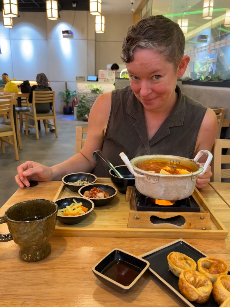 KL has the most impressive and entertaining aquarium I have seen. Anyone want to pet a green lobster?I’m really not sure why they have meerkats…Or chameleons…Or lizards. But they are all cute so I won’t argue. Did you know the spiky looking things are soft?!Frogs at least are amphibious…Then it gets better and better. I was fascinated by these tiny eels. Some go up while others go down. Watching them was so funny and soothing at the same time. And they had friends. The zebra stripe in the back is a big eel who is hiding his head from the camera. The plates are because they are talking about shipwrecks being habitat for sea life now. This little guy was so beautiful! I can’t believe the concentric colors on his spots. How does a clam have lightning going off in its flesh?The stairs are in the left of the photo. You are coming down next to the tornado of fish into a few huge shared tanks. Giant prehistoric looking fishWeird white fish3-4 foot rays coming up the side of the glassAnd fish you might see snorkeling I like trigger fish, I wish you could see its fins going wildly fast side to sideAnd then, you get to the tunnel!Then the sharks and rays just glide right over your headAnd weird ones you’ve never heard ofAnd leopard onesWith blue friends Who come inAnd snuggle for a whileThen go on their fluttering way. This was so magical to stand and watch them interact up close. They both seem rare beauties. And then these guys just make you giggle. Who thought to cross a ray with a pig?Just flapping along And this guy looks pretty scary when you see his teeth from below, but I guess he doesn’t eat his tank mates. I swear anyone with anxiety should be prescribed time here every day. The slow gliding floating movements are so calming. And you just might see a unicorn. And I swear who could avoid feeling a little more light hearted with these guys around. And you could feel seen and known by this grumpy old guy. And talk about what makes you angry in the world with this guy. I’m sure he’d agree. It isn’t a solution to problems, but it can somehow still make life better. At least for me.When you finally bring yourself to leave the tunnel, then you get jellyfish and their easy pulsing slowness to slowly bring you back to reality gently.And you get some moments with the octopus.And why upside down jellyfish?Seahorses!CamouflageZarah got soup with fire! View from the workout room in our apartment building. The next day we gave in to our missing of having our own animals. Noodles was the last, at 21 yo and she died in June. So it’s been 9 months. Street cats are sweet for a few pets, but we wanted more. So a Cat cafe! Palatial purring big guy. He was lying in the fan and his hair was blowing like a shampoo commercial. They have lots of places to be. And the rules are you can’t wake up a sleeping cat and you can’t pick them up everThey have 36 cats of all kinds. Including a “munchkin cat” which I had never heard of. Alert catsLong catsAnd kitten that crawled into my lap!Clearly I couldn’t move for quite some time. I nice last day in KL.And a wonderful last float in the 8th floor infinity pool feeling like fancy girls and listening to the muezzin.
