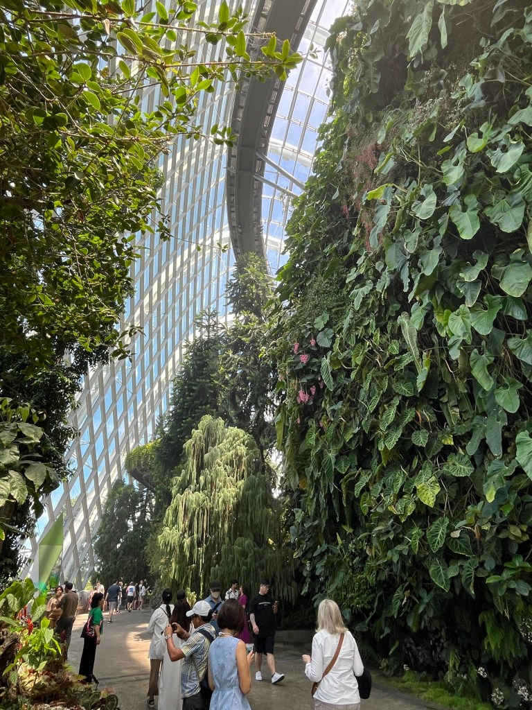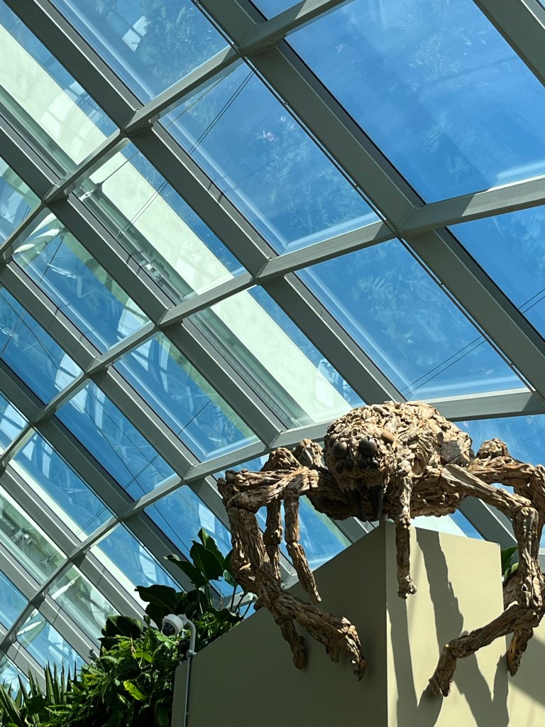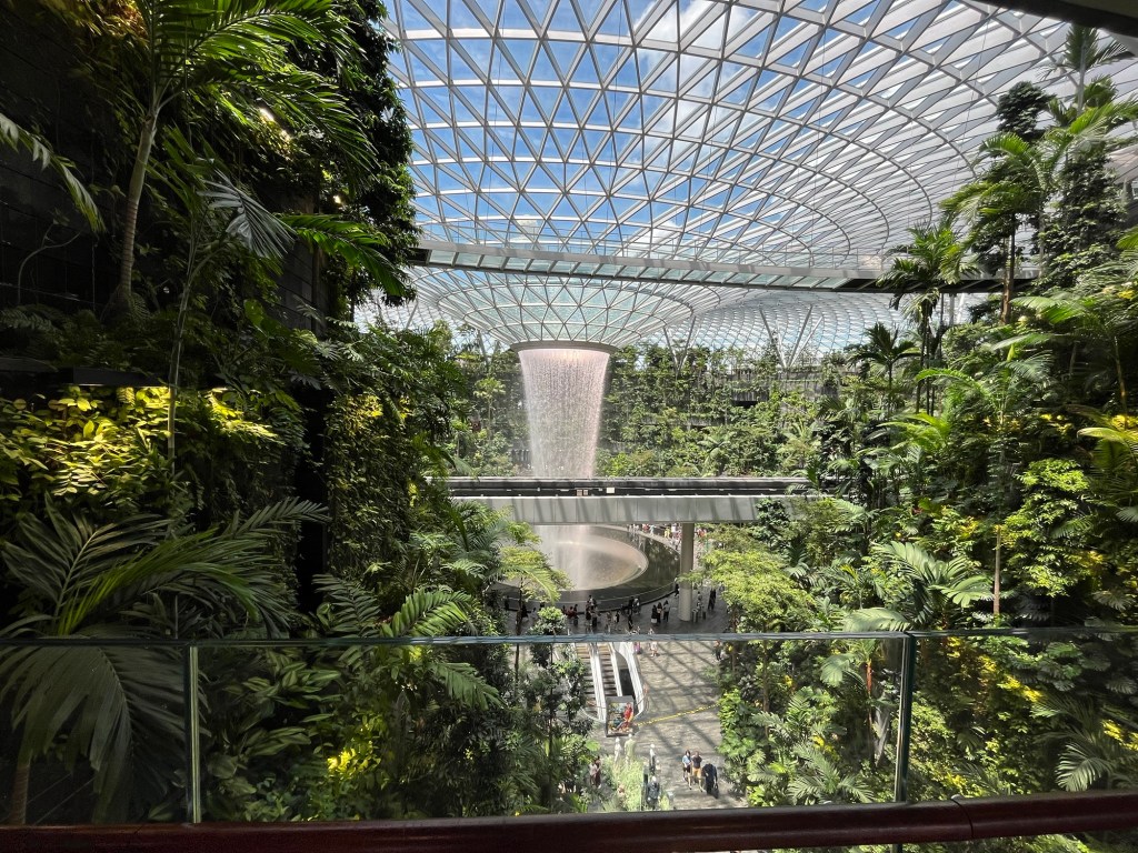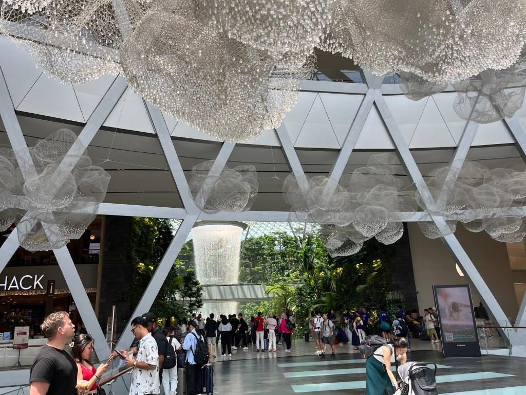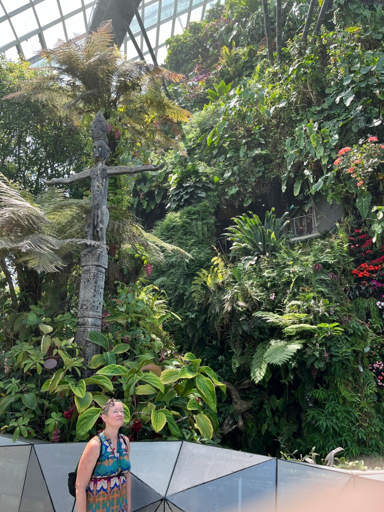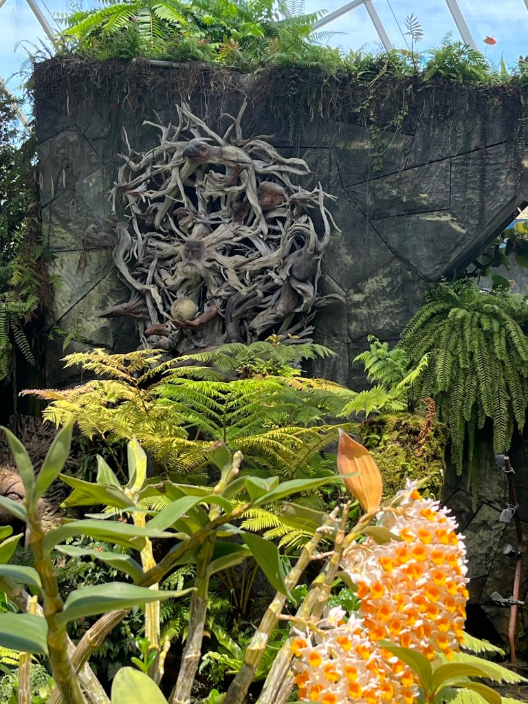 And then the super trees have a concert!They have different music themes, some people we met saw 80’s remix. But the drama of this was really good.More street art in Chinatown I like the art and the placard talks about living conditions in Singapore in the 1930sImitating street art is fun. Gardens by the Bay Cloud Forest- greeted by cool air and a waterfallMany levels and layers. Note the walkway aboveLittle lambsThere were a bunch of different artists represented. This is in the exhibit about the South American cloud forest. As you go higher it is meant to be like gaining elevation through different zones. The mist is actually up there in the cloud forest part at the top. The driftwood artist was my favorite. South African areaAmerican areaWall of orchidsPitcher plants of many kindsI appreciate the humor in the warningThe pitchers all together. And yes, Dale Chihuly is literally everywhere. View back down from the topSelfie with some pretty stuffDragon wallGoing back downMore driftwood Microscopic orchids!!! Who knew?!More driftwood- I love this artist!These last few are in the Flower Dome – the smaller of the enclosures. We were not so excited about their sakura display, especially having just been to Japan but we liked bits of it Back out in the garden there’s a great procession of bronze animals. Even though I was hot and tired, this site of so many kites got me to take a walk. and found this park/water department areaYou know the water department should be pretty too. And have fun wading pools for kids. They are hard to see on a phone screen but there were so so many kites all flying. I’m surprised more don’t tangle each other. How did they get all this done? It is so mind blowing that such a young small country has been so forward thinking and functional that they got so much done for people. Walking and cycling path across the barrier between sea and river. More park on the other side. The little white awnings are picnic areas. The Bay- I have never seen so many shipping boats together.Sunset starting as I head home. The Eye wheel is the world’s 2nd largest. It has 28 capsules that hold 28 people in 280 square feet. 28 sounds like/symbolizes “easy prosperity” in Chinese. More public health media in the subway tunnelHave we talked about cuteness? Best guess is this is a robot sweeper at the airport. OMG the airport! The ceiling sculptures with little crystals to look like rain from clouds. And yes, that is a waterfall!It falls three stories.Yes, this is the airport, or the mall in the center of the four terminals by of the airport.Then it falls a couple more stories enclosed so it doesn’t splash. And here’s the food court. Nice but not overly fancy. A good mix.