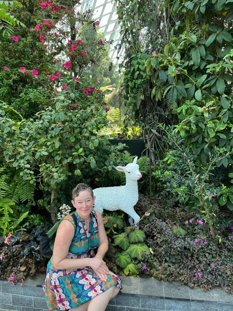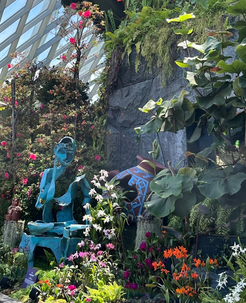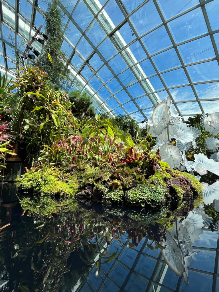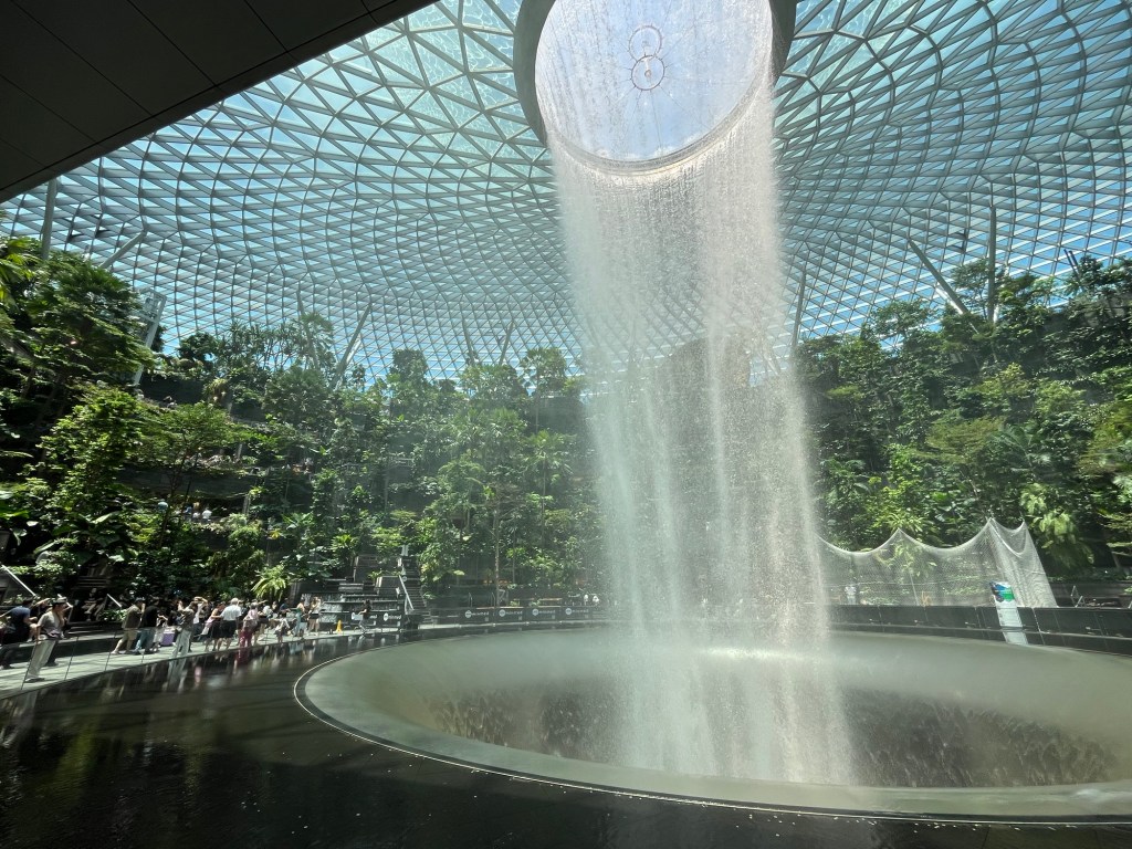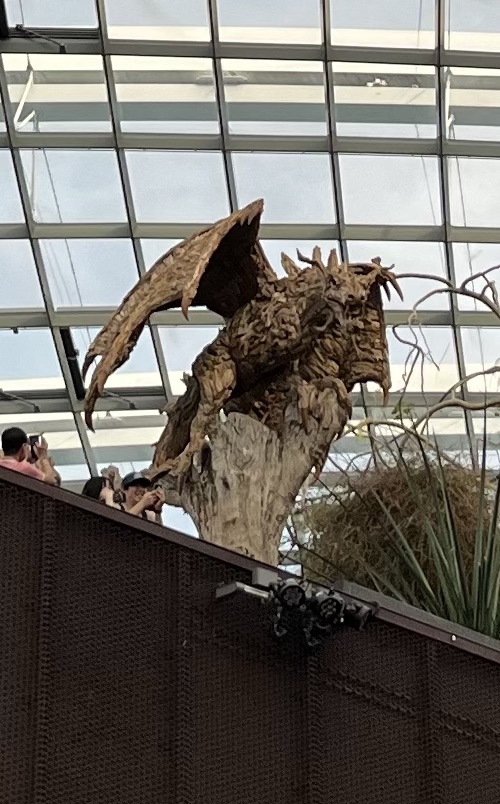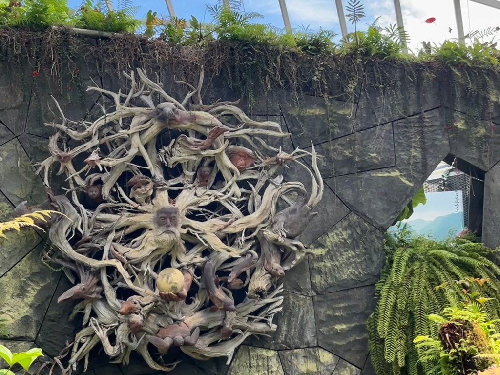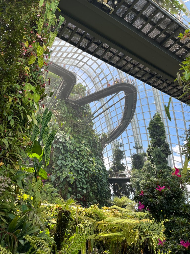 And then the super trees have a concert!They have different music themes, some people we met saw 80’s remix. But the drama of this was really good.More street art in Chinatown I like the art and the placard talks about living conditions in Singapore in the 1930sImitating street art is fun. Gardens by the Bay Cloud Forest- greeted by cool air and a waterfallMany levels and layers. Note the walkway aboveLittle lambsThere were a bunch of different artists represented. This is in the exhibit about the South American cloud forest. As you go higher it is meant to be like gaining elevation through different zones. The mist is actually up there in the cloud forest part at the top. The driftwood artist was my favorite. South African areaAmerican areaWall of orchidsPitcher plants of many kindsI appreciate the humor in the warningThe pitchers all together. And yes, Dale Chihuly is literally everywhere. View back down from the topSelfie with some pretty stuffDragon wallGoing back downMore driftwood Microscopic orchids!!! Who knew?!More driftwood- I love this artist!These last few are in the Flower Dome – the smaller of the enclosures. We were not so excited about their sakura display, especially having just been to Japan but we liked bits of it Back out in the garden there’s a great procession of bronze animals. Even though I was hot and tired, this site of so many kites got me to take a walk. and found this park/water department areaYou know the water department should be pretty too. And have fun wading pools for kids. They are hard to see on a phone screen but there were so so many kites all flying. I’m surprised more don’t tangle each other. How did they get all this done? It is so mind blowing that such a young small country has been so forward thinking and functional that they got so much done for people. Walking and cycling path across the barrier between sea and river. More park on the other side. The little white awnings are picnic areas. The Bay- I have never seen so many shipping boats together.Sunset starting as I head home. The Eye wheel is the world’s 2nd largest. It has 28 capsules that hold 28 people in 280 square feet. 28 sounds like/symbolizes “easy prosperity” in Chinese. More public health media in the subway tunnelHave we talked about cuteness? Best guess is this is a robot sweeper at the airport. OMG the airport! The ceiling sculptures with little crystals to look like rain from clouds. And yes, that is a waterfall!It falls three stories.Yes, this is the airport, or the mall in the center of the four terminals by of the airport.Then it falls a couple more stories enclosed so it doesn’t splash. And here’s the food court. Nice but not overly fancy. A good mix.