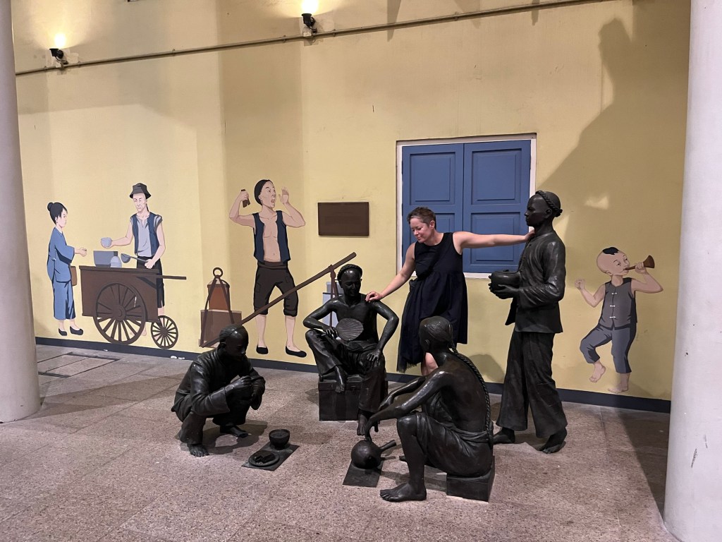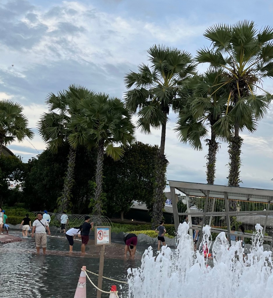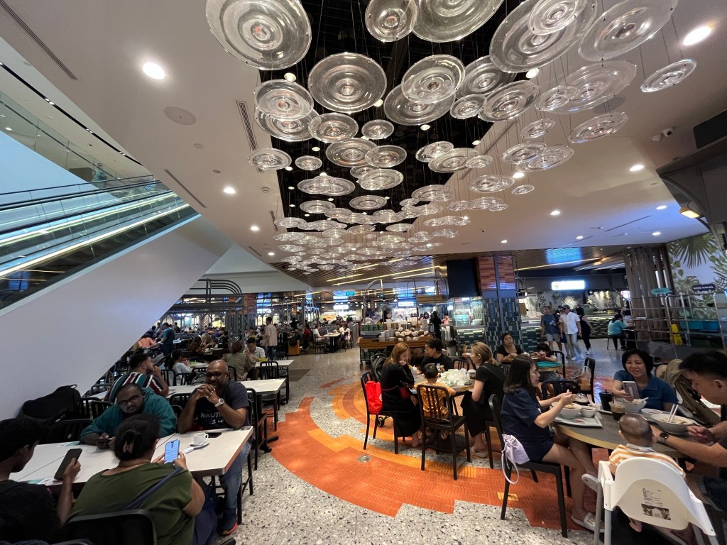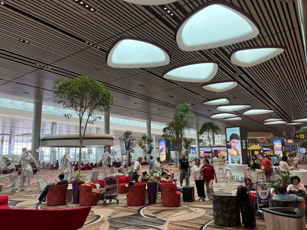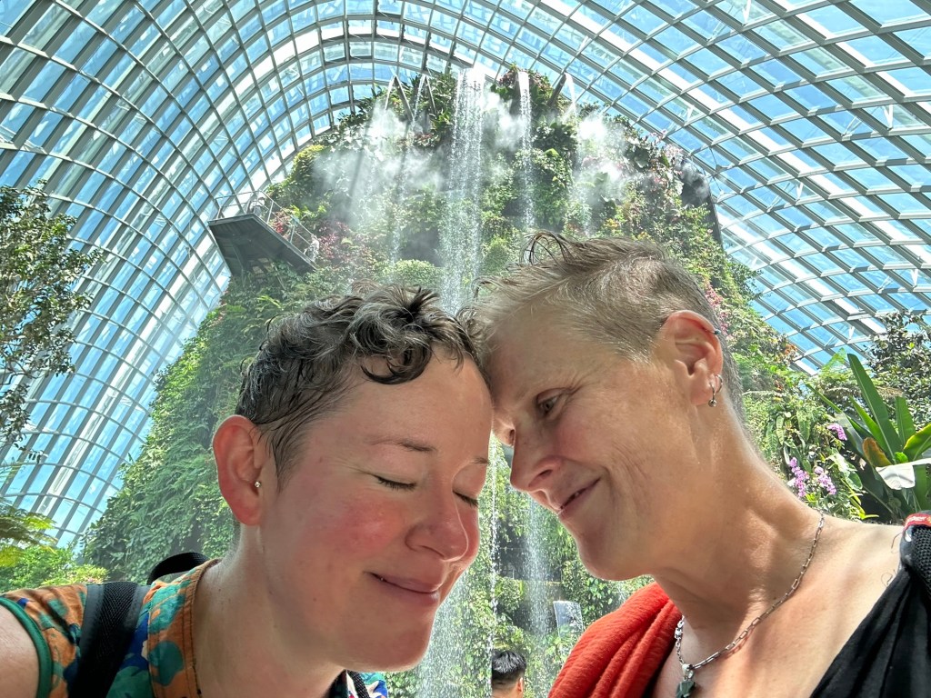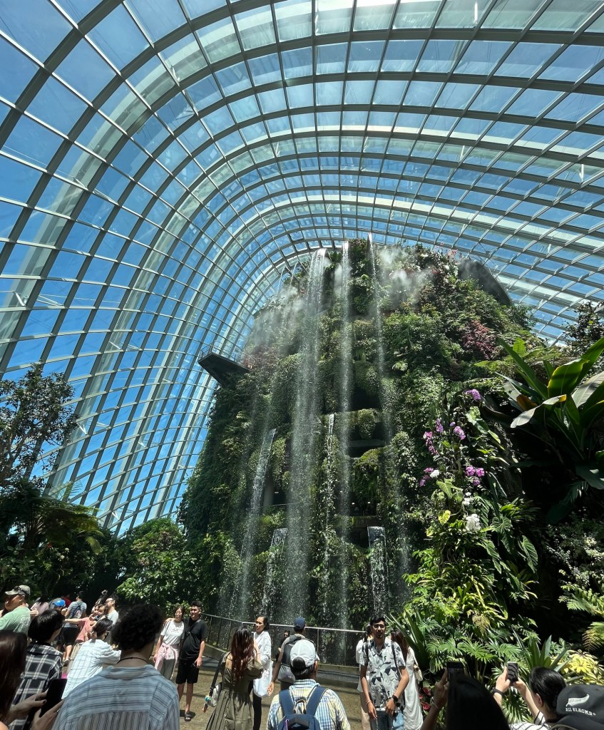 And then the super trees have a concert!They have different music themes, some people we met saw 80’s remix. But the drama of this was really good.More street art in Chinatown I like the art and the placard talks about living conditions in Singapore in the 1930sImitating street art is fun. Gardens by the Bay Cloud Forest- greeted by cool air and a waterfallMany levels and layers. Note the walkway aboveLittle lambsThere were a bunch of different artists represented. This is in the exhibit about the South American cloud forest. As you go higher it is meant to be like gaining elevation through different zones. The mist is actually up there in the cloud forest part at the top. The driftwood artist was my favorite. South African areaAmerican areaWall of orchidsPitcher plants of many kindsI appreciate the humor in the warningThe pitchers all together. And yes, Dale Chihuly is literally everywhere. View back down from the topSelfie with some pretty stuffDragon wallGoing back downMore driftwood Microscopic orchids!!! Who knew?!More driftwood- I love this artist!These last few are in the Flower Dome – the smaller of the enclosures. We were not so excited about their sakura display, especially having just been to Japan but we liked bits of it Back out in the garden there’s a great procession of bronze animals. Even though I was hot and tired, this site of so many kites got me to take a walk. and found this park/water department areaYou know the water department should be pretty too. And have fun wading pools for kids. They are hard to see on a phone screen but there were so so many kites all flying. I’m surprised more don’t tangle each other. How did they get all this done? It is so mind blowing that such a young small country has been so forward thinking and functional that they got so much done for people. Walking and cycling path across the barrier between sea and river. More park on the other side. The little white awnings are picnic areas. The Bay- I have never seen so many shipping boats together.Sunset starting as I head home. The Eye wheel is the world’s 2nd largest. It has 28 capsules that hold 28 people in 280 square feet. 28 sounds like/symbolizes “easy prosperity” in Chinese. More public health media in the subway tunnelHave we talked about cuteness? Best guess is this is a robot sweeper at the airport. OMG the airport! The ceiling sculptures with little crystals to look like rain from clouds. And yes, that is a waterfall!It falls three stories.Yes, this is the airport, or the mall in the center of the four terminals by of the airport.Then it falls a couple more stories enclosed so it doesn’t splash. And here’s the food court. Nice but not overly fancy. A good mix.