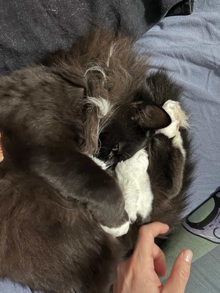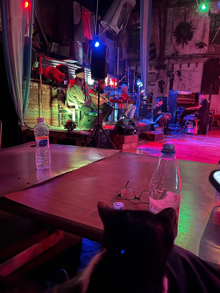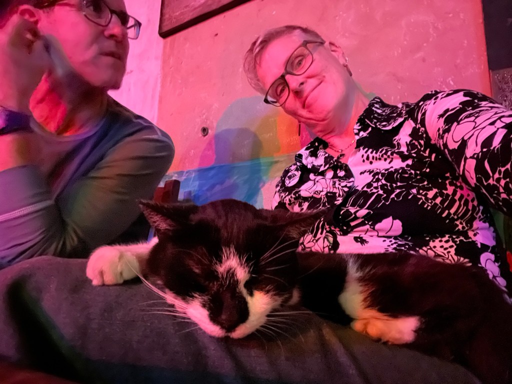 And a cat, stray as far as I can tell, just wandered up to the second floor where there are 50+ people and a loud live band. And just curled up on my lap and enjoyed some petting.