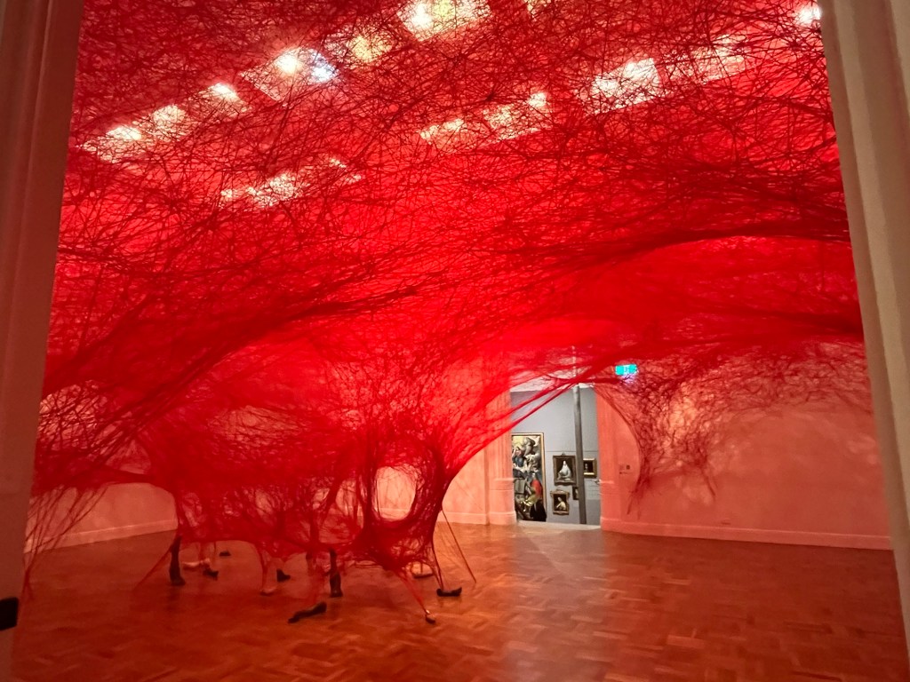 This was so so cool to walk through. Shaped as I imagine fascia connecting and pulling all the many directions in the warm red of our blood. The shoes and arms and things I’m just choosing to have be the mundane things that are pulled by the beautiful matrix. I am pretty sure that is not the intended interpretation, but I like it.
