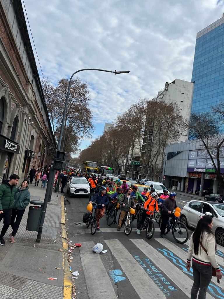 Giant group of bikers with orange balloons on a weekend. They stretch back a full block. I don’t know why…